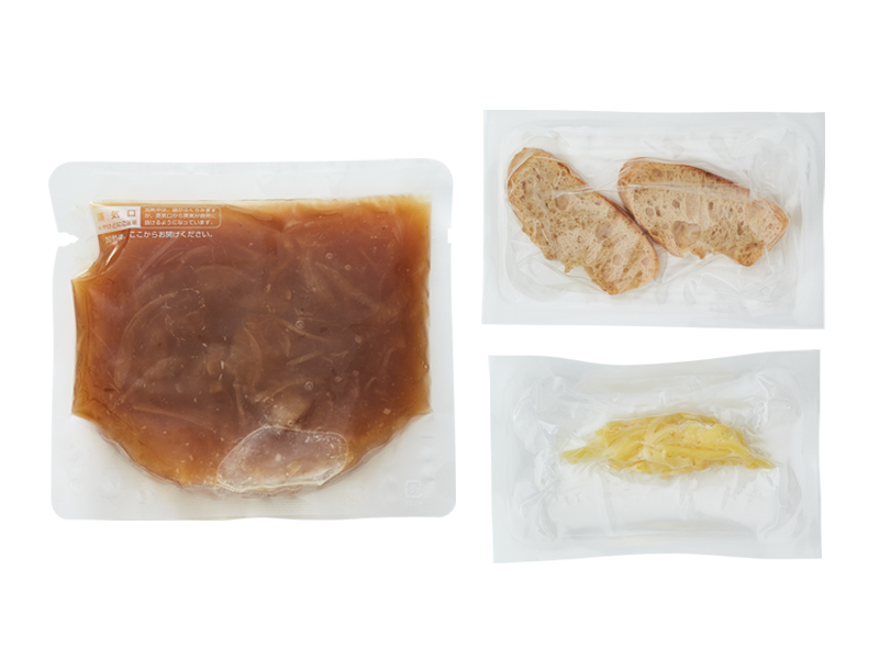 飴色になるまでじっくり炒めた玉ねぎの甘さやコクを存分に味わえるスープ。バゲットとチーズをのせてオーブントースターで焼き上げ、焦げ目がついたらできあがり。口に入れた瞬間、じゅわっと広がるバゲットにしみ込んだスープのおいしさ、チーズの香ばしさがたまらない季節限定のメニューです。ご自宅で仕上げていただく商品です。