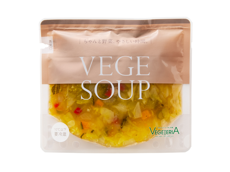 ブロッコリーやかぼちゃなどの野菜を、野菜ブイヨンとシンプルな味付けで仕上げました。野菜の色や食感を大切にしたやさしい味わいのスープです。